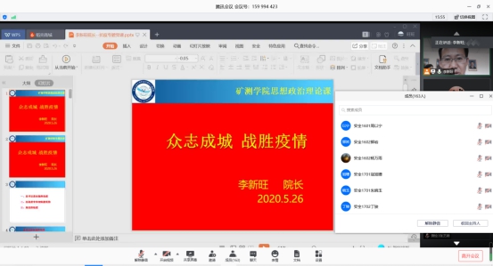 2020年5月26日,院长李新旺在507会议室为学生上思想政治课,本次会议采用线上线下同时进行的方式,院办、学工办相关人员在现场参会,学院全体中共党员、预备党员、入党积极分子以及测绘1901、测绘1902、测绘1903班同学共160余人参加会议。