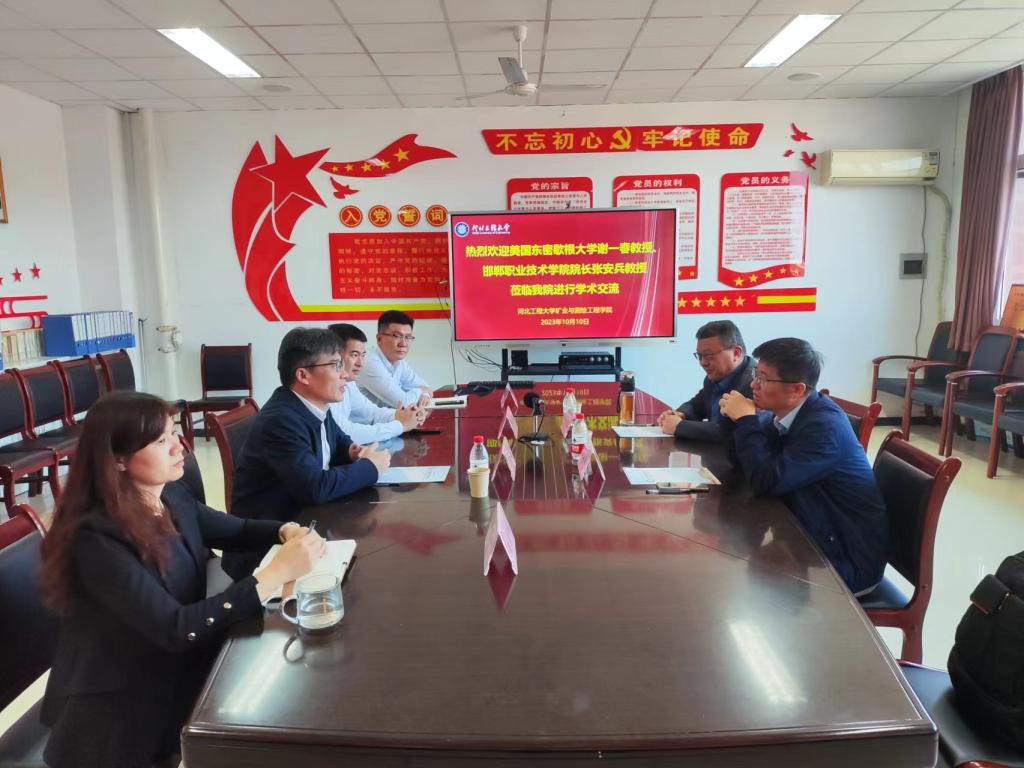 2023年10月10日,美国东密歇根大学谢一春教授在邯郸职业技术学院张安兵校长的陪同下来到151amjs澳金沙门进行学术交流访问,学校党委书记于树江会见了来访客人并座谈,学院领导班子成员及相关系室负责人参加了座谈会。